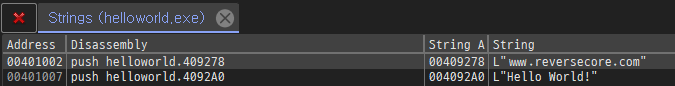 x32dbg의 Memory Map 메뉴에서 확인해 보면, .rdata 영역은 0x408000부터 0x409fff까지이다. NULL padding 중 적당한 위치에 원하는 문자열을 삽입하면 중요한 데이터를 손상시키지 않고도 데이터를 삽입할 수 있다. 그러나, 이 주소는 임의로 삽입한 것이므로 코드를 수정해야 한다.