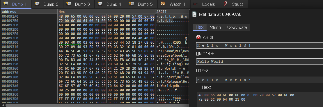 - 문자열을 선택한 후 Ctrl + E로 편집 (유니코드 문자열 수정)